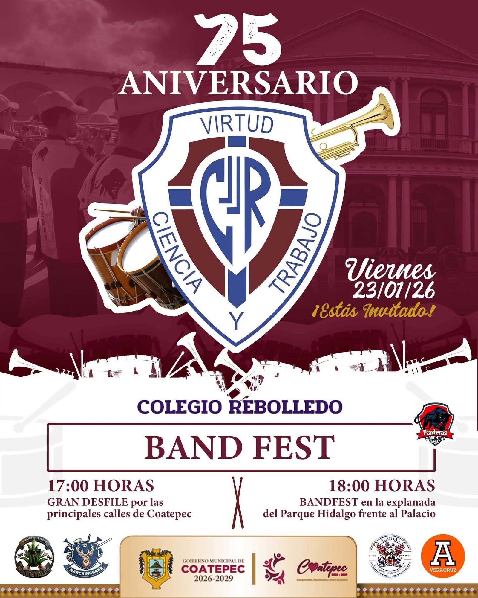 En el marco de las actividades conmemorativas por el 75 aniversario del Colegio Rebolledo, el municipio de Coatepec será sede del Band Fest Coatepec 2026, un encuentro musical que llenará de ritmo, color y tradición las calles de la ciudad.