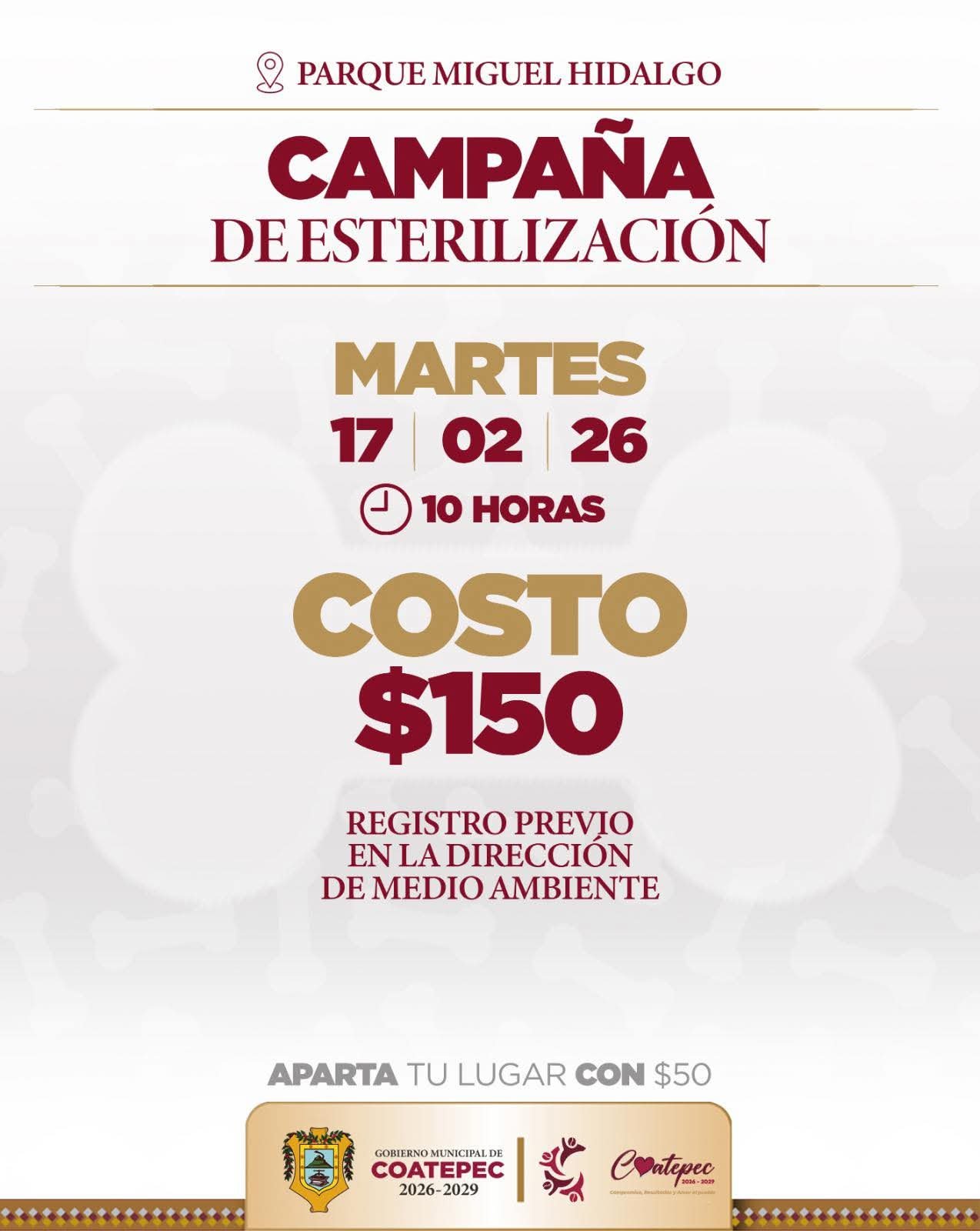 El costo por esterilización será de 150 pesos, con la finalidad de facilitar el acceso a este servicio y contribuir a la reducción de la sobrepoblación animal, así como a la prevención del abandono y el maltrato.