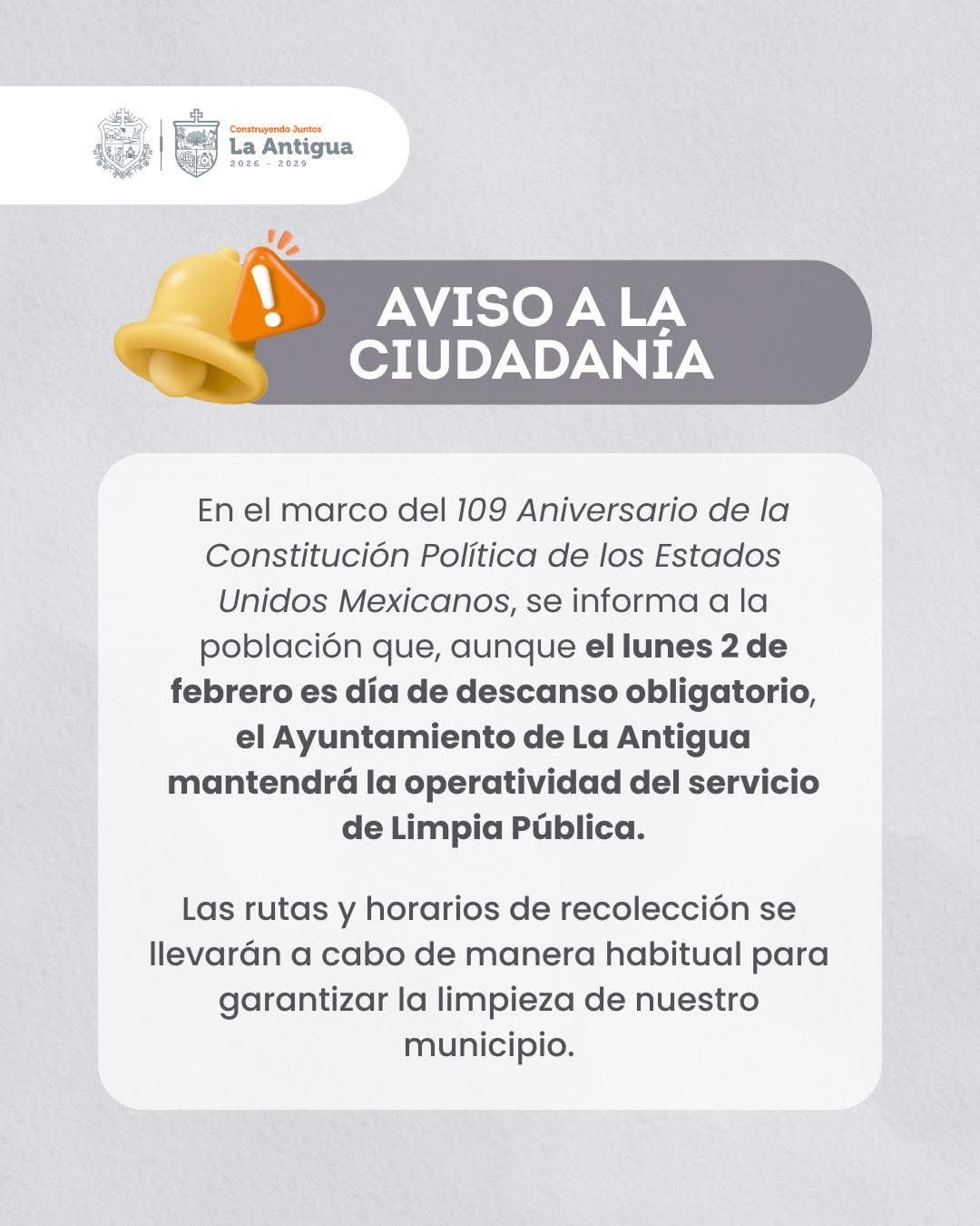 El H. Ayuntamiento de La Antigua informó que el próximo 2 de febrero no habrá actividades administrativas en la sede municipal, de acuerdo con lo establecido en la legislación vigente.