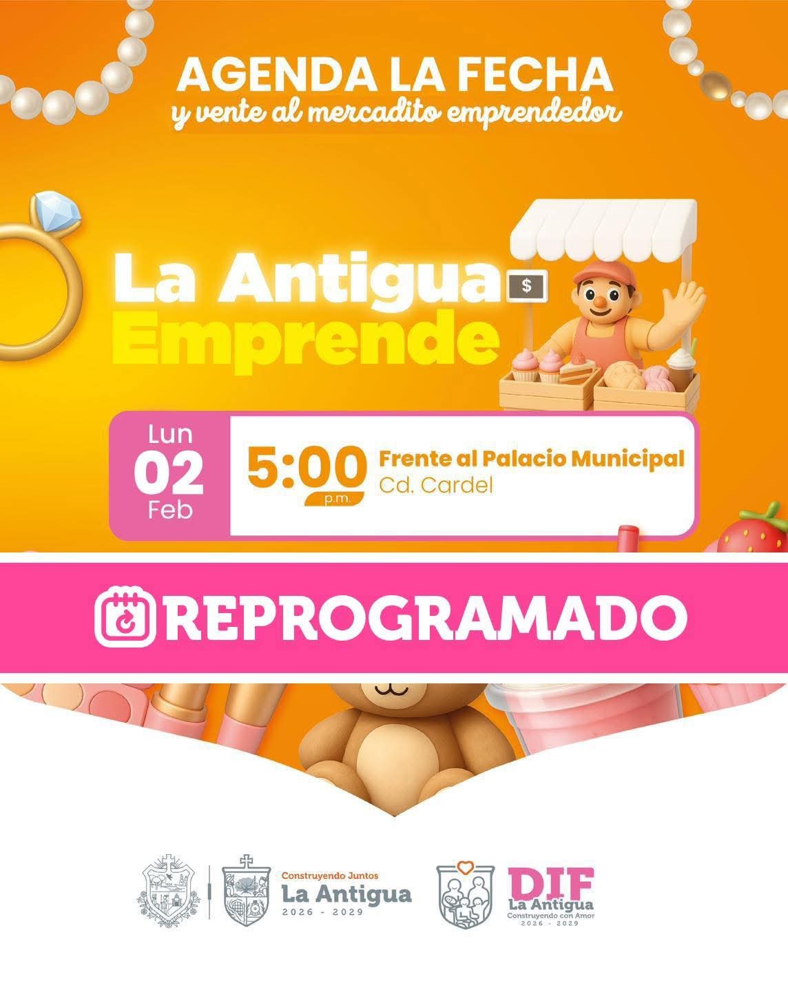 Por recomendación de la Coordinación de Protección Civil, el Mercadito La Antigua Emprende fue pospuesto para mañana lunes 02 de febrero, debido a las condiciones climatológicas adversas y la presencia de lluvia ligera registrada durante el día.